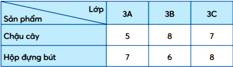 Cho bảng thống kê số chậu cây và hộp dựng bút của khối 3 như sau: