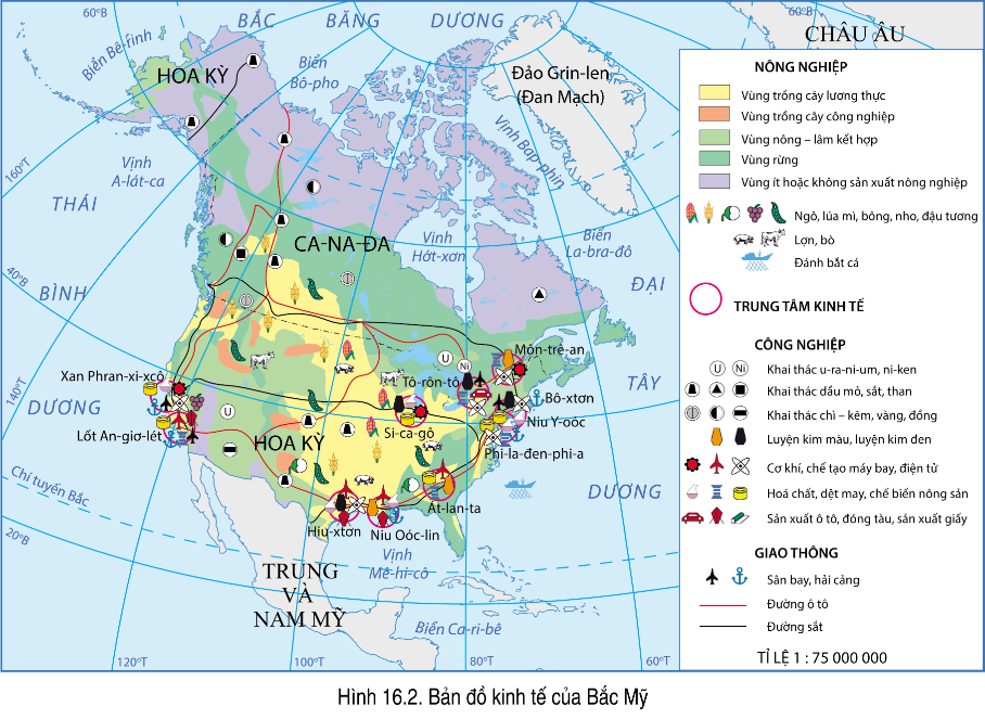 Đọc thông tin và quan sát hình 16.2, hãy xác định sự phân bố một số trung tâm kinh tế quan trọng của Bắc Mỹ. Nêu những ngành công nghiệp quan trọng của trung tâm này.