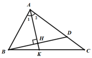 Cho tam giác \(ABC\) có \(AB < AC\). Tia phân giác của góc \(A\) cắt \(BC\) ở \(K\). Từ \(B\) kẻ đường vuông góc với \(AK\) tại \(H\) cắt \(AC\) ở \(D\). Chọn câu sai.