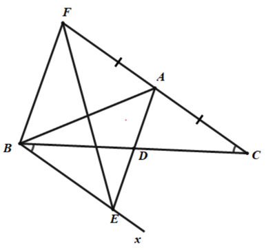 Cho \(\Delta ABC\) có \(D\) là trung điểm của \(BC\). Qua \(B\) vẽ tia \(Bx{\rm{ // }}AC\), \(Bx\) cắt tia
