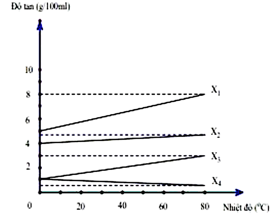 Độ tan của một chất trong nước là số gam chất đó hòa tan trong 100 gam nước để tạo thành dung dịch bão hỏa ở một nhiệt độ xác định. Thông thường, độ tan của chất rắn tăng còn độ tan của chất khí giảm khi nhiệt độ tăng. Đồ thị dưới đây thể hiện sự thay đổi độ tan của một số chất tan theo nhiệt độ (ký hiệu các chất là X1, X2, X3, X4)