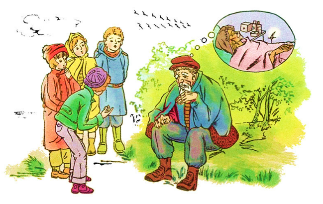 Đám trẻ lặng đi. Các em nhìn cụ già đầy thương cảm.
