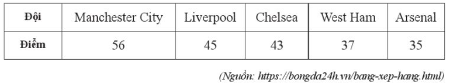 Tính đến ngày 19/01/2022, trong bảng xếp hạng giải bóng đá Ngoại hạng Anh (Vòng 24), số điểm của 5 đội dẫn đầu bảng như sau: