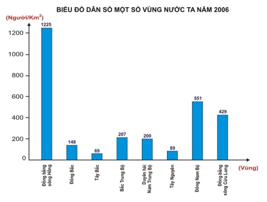 Cho biểu đồ cột (hình vẽ) biểu diễn mật độ số dân số một số vùng nước ta năm 2006.