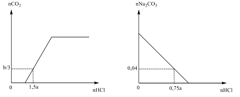 Cho từ từ dung dịc HCl đến dư vào dung dịch X chứa a mol Na2CO3, b mol NaHCO3. Ta có đồ thị như hai hình dưới đây: