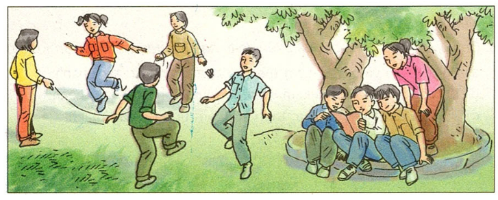 Quan sát tranh vẽ dưới đây và nêu 2 – 3 câu kể nêu hoạt động miêu tả hoạt động của các nhân vật trong tranh.