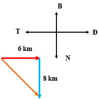 Một xe máy đi 6 km về phía Đông, sau đó đi tiếp 8km về phía Nam. Độ dịch chuyển tổng hợp là