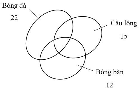 Lớp 5E có 40 học sinh đăng ký các môn thể thao cho kỳ hè. Gồm ba môn đá bóng, cầu lông và bóng bàn. Sau khi đăng ký, thầy giáo tổng hợp được kết quả như sau: Có 22 bạn đăng ký môn bóng đá, 15 đăng ký môn cầu lông, 12 bạn đăng ký môn bóng bàn, 5 bạn đăng ký cả bóng đá và cầu lông, 2 bạn đăng ký cả cầu lông và bóng bàn, 6 bạn đăng ký bóng bàn và bóng đá, chỉ có duy nhất 1 bạn đăng ký cả ba môn. Hỏi lớp học đó có bao nhiêu học sinh không đăng ký môn thể thao nào?