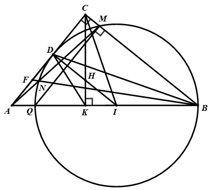 Cho tam giác \(ABC\) vuông tại \(C\,\,\left( {AC < BC} \right)\), đường cao \(CK\) và đường phân giác trong \(BD\) \(\left( {K \in AB,D \in AC} \right)\). Qua \(D\) kẻ đường thẳng vuông góc với \(AC\) cắt \(CK,{\rm{ }}AB\) lần lượt tại \(H\) và \(I\).