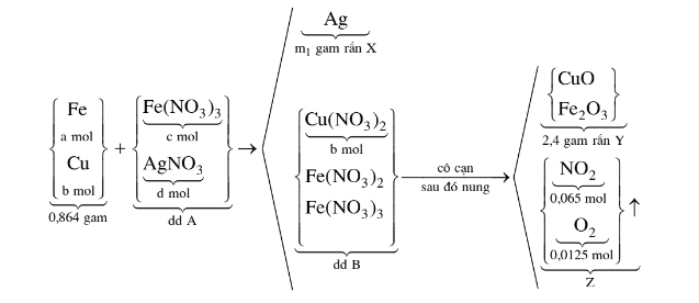 Cho 0,864 gam hỗn hợp kim loại Fe và Cu tác dụng với 250 ml dung dịch A chứa đồng thời Fe(NO3)3 và AgNO3, thu được m1 gam chất rắn X và dung dịch B. Cô cạn dung dịch B rồi nung cặn rắn trong bình kín (không có không khí) tới khối lượng không đổi, thu được 2,4 gam chất rắn Y và hỗn hợp khí Z. Hấp thụ hoàn toàn Z vào nước tạo ra dung dịch C. Dung dịch này phản ứng vừa đủ với 130 ml dung dịch NaOH 0,5 M thu được hai muối với tỉ lệ mol 23 : 3. Biết các phản ứng xảy ra hoàn toàn.