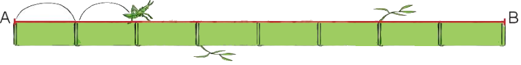 Xác định xem đoạn thẳng AB dài bằng mấy đốt tre rồi tính được trung điểm đoạn thẳng AB cách điểm A mấy đốt tre, từ đó đếm số bước cào cào cần nhảy thêm để đến được trung điểm của đoạn AB.