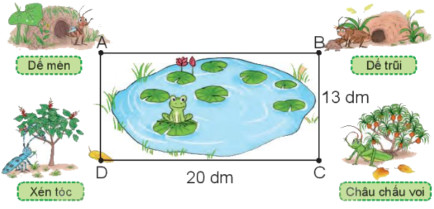 Nhà các bạn dế mèn, dế trũi, châu chấu voi và xén tóc ở bốn đỉnh của hình chữ nhật ABCD (như hình vẽ). Biết rằng BC = 13 dm, CD = 20 dm.