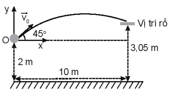 Một cầu thủ bóng rổ cao 2 m đứng cách xa rổ 10 m theo phương nằm ngang để tập ném bóng vào rổ. Biết miệng rổ ở độ cao 3,05 m. Hỏi người đó phải ném bóng từ độ cao ngang đầu với vận tốc theo phương \({45^0}\) có độ lớn bằng bao nhiêu để bóng rơi vào rổ? Lấy \(g = 9,8\,\,m/{s^2}\).