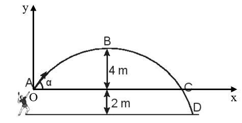 Hình bên vẽ quỹ đạo của một quả cầu lông được đánh lên với vận tốc ban đầu \({v_0} = 10\,\,m/s\) ở độ cao 2 m so với mặt đất. Bỏ qua sức cản của không khí và lấy \(g = 9,8\,\,m/{s^2}\). Xác định độ lớn vận tốc của quả cầu ở vị trí B.