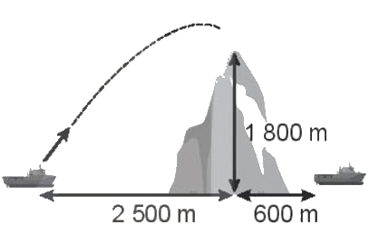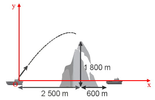 Một con tàu chiến ở bên này ngọn núi trên một hòn đảo, bắn một viên đạn với vận tốc ban đầu 250 m/s theo phương nghiêng góc \({75^0}\) so với mặt nước biển tới đích là một con tàu khác nằm ở phía bên kia ngọn núi. Biết vị trí của hai con tàu và độ cao của ngọn núi được mô tả như hình vẽ. Hỏi viên đạn có qua được đỉnh núi không và có rơi trúng con tàu kia không?