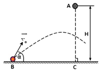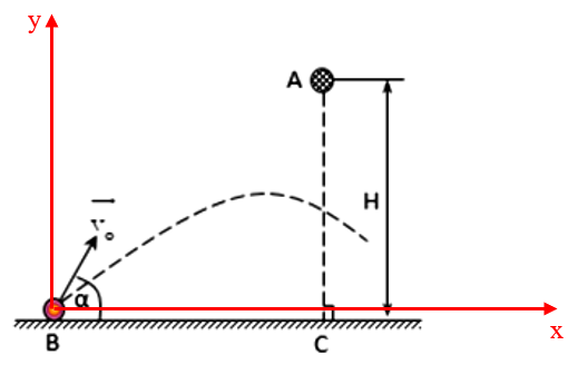 Từ A (độ cao AC = H = 3,6 m) người ta thả một vật rơi tự do, cùng lúc đó từ B cách C một đoạn BC = L = H người ta ném một vật khác với vận tốc ban đầu \({v_0}\) hợp với phương ngang góc \(\alpha \). Tính \(\alpha \) và \({v_0}\) để hai vật gặp được nhau khi chúng đang chuyển động.