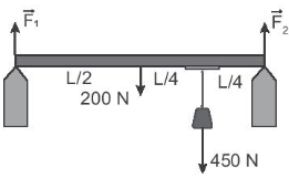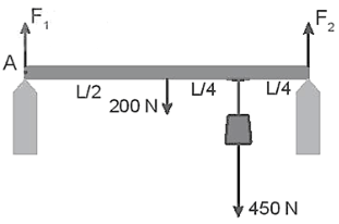 Một thanh đồng chất có chiều dài L, trọng lượng 200 N, treo một vật có trọng lượng 450 N vào thanh như hình vẽ. Các lực \(\overrightarrow {{F_1}} ,\overrightarrow {{F_2}} \) của thanh tác dụng lên hai điểm tựa có độ lớn lần lượt là: