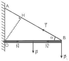 Một thanh có độ dài L, trọng lượng 10 N, được treo nằm ngang vào tường như hình vẽ. Một trọng vật 20 N treo ở đầu thanh. Dây treo làm với thanh một góc \(\alpha = {30^0}\). Xác định lực căng của dây treo.