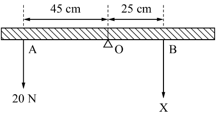 Một thanh đồng chất tì lên giá đỡ tại O và được giữ nằm cân bằng với hai lực đặt tại A và B như hình vẽ. Vì thanh cân bằng nên hai lực A và B sẽ cho hợp lực đặt tại O. Độ lớn của lực tại B là