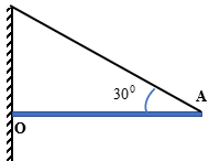 Một thanh dài AO, đều đồng chất, có khối lượng 1,0 kg. Một đầu O của thanh liên kết với tường bằng một bản lề, còn đầu A được treo vào tường bằng một sợi dây AB. Thanh được giữ nằm ngang và dây làm với thanh một góc \(\alpha = {30^0}\) (như hình vẽ). Lấy \(g = 10m/{s^2}\). Tính lực căng của dây.