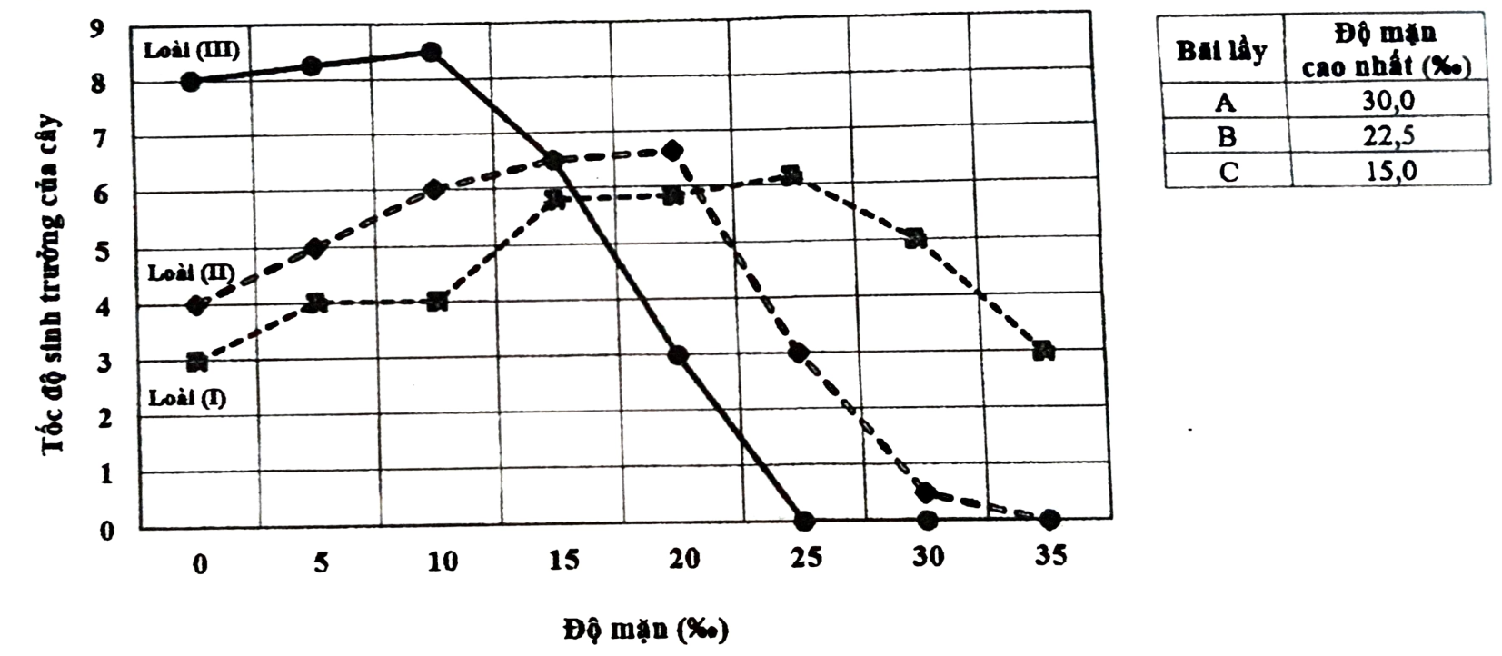 Hình dưới đây minh hoạ tốc độ sinh trưởng giả định của ba loài cây ngập mặn thân gỗ lâu năm kí hiệu là loài (I), (II) và (III) tương ứng với các điều kiện độ mặn khác nhau. Số liệu trong bảng dưới đây cho biết độ mặn cao nhất tại ba bãi lầy ven biển A, B và C của địa phương H. Giả sử các điều kiện sinh thái khác của ba bãi lầy này là tương đồng nhau, không ảnh hưởng đến sức sống của các loài cây này và sự sai khác về độ mặn giữa các vị trí trong mỗi bãi lầy là không đáng kể. Các cây con của ba loài này khi trồng không thể sống được ở các dải độ mặn có tốc độ sinh trưởng bằng 0.