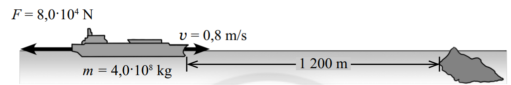 Một tàu chở hàng có tổng khối lượng là \(4,{0.10^8}\,\,kg\) đang vận chuyển hàng hóa đến nơi tiếp nhận thì đột nhiên động cơ tàu bị hỏng, lúc này gió thổi tàu chuyển động thẳng về phía đá ngầm với tốc độ không đổi 0,8 m/s. Khi tàu chỉ còn cách bãi đá ngầm một khoảng 1200 m thì gió ngưng thổi, đồng thời động cơ cũng được sửa chữa xong và hoạt động lại. Tuy nhiên bánh lái của tàu bị kẹt và vì vậy, tàu chỉ có thể tăng tốc lùi thẳng ra xa khỏi bãi đã ngầm (hình vẽ). Biết lực do động cơ sinh ra có độ lớn \(8,{0.10^4}\,\,N\) và lực cản xem như không đáng kể.