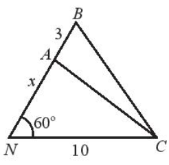 Khoảng cách từ nhà An ở vị trí N đến cột điện C là 10m. Từ nhà, An đi x mét theo phương tạo với NC một góc 600 đến vị trí A sau đó đi tiếp 3m đến vị trí B như Hình bên.