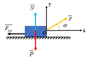Một vật nhỏ khối lượng m chuyển động theo trục Ox trên mặt phẳng nằm ngang dưới tác dụng của lực kéo \(\overrightarrow F \) theo hướng hợp với Ox góc \(\alpha > 0\). Hệ số ma sát trượt trên mặt ngang bằng \({\mu _t}\). Xác định gia tốc chuyển động của vật.