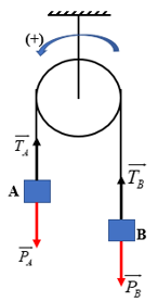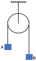 Hai vật A và B có khối lượng lần lượt là \({m_A} = 600g\), \({m_B} = 400g\) được nối với nhau bằng sợi dây nhẹ không dãn và vắt qua ròng rọc cố định như hình vẽ. Bỏ qua khối lượng của ròng rọc và lực ma sát giữa dây và ròng rọc. Lấy \(g = 10m/{s^2}\). Tính gia tốc chuyển động của mỗi vật.