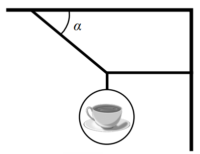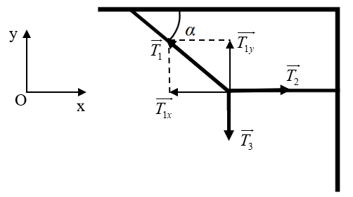 Biển quảng cáo của một quán cà phê được treo cân bằng nhờ một dây nằm ngang và dây còn lại hợp với trần một góc \(\alpha \) như hình vẽ. Giữ cho một dây luôn căng và có phương nằm ngang, thay đổi vị trí và độ dài dây treo trên trần. Xác định điều kiện góc \(\alpha \) để hệ có thể cân bằng.