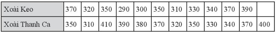 Bạn Hà ghi lại khối lượng của một số quả xoài Keo và xoài Thanh Ca ở bảng sau (đơn vị: gam)