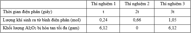 Điện phân dung dịch chứa x mol CuSO4, y mol H2SO4 và z mol NaCl (với điện cực trơ, có màng ngăn xốp, hiệu suất điện phân là 100%). Lượng khí sinh ra từ quá trính điện phân và khối lượng Al2O3 bị hòa tan tối đa trong dung dịch sau điện phân ứng với mỗi thí nghiệm được cho ở bảng dưới đây: