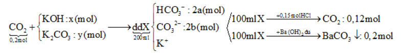 Hấp thụ hết 4,48 lít khí CO2 (đktc) vào dung dịch chứa x mol KOH và y mol K2CO3, thu được 200 ml