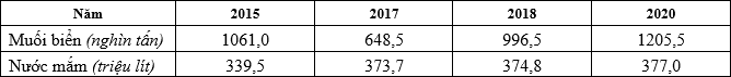 Cho bảng số liệu: SẢN LƯỢNG MUỐI BIỂN VÀ NƯỚC MẮM CỦA NƯỚC TA GIAI ĐOẠN 2015 – 2020