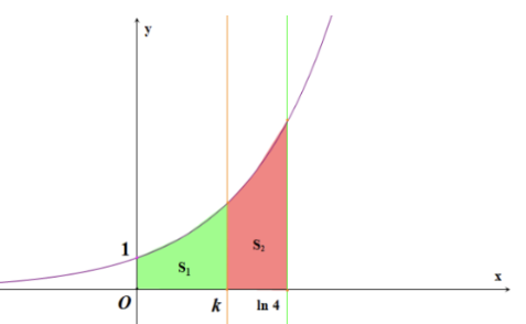 Cho hình thang cong (H) giới hạn bởi các đường \(y = {e^x},\,\,y = 0,\,\,x = 0,\,\,x = \ln 4\). Đường thẳng x = k (0 < k < ln4) chia (H) thành hai phần có diện tích là S1 và S2 như hình vẽ bên. Tìm k để S1 = 2S2.