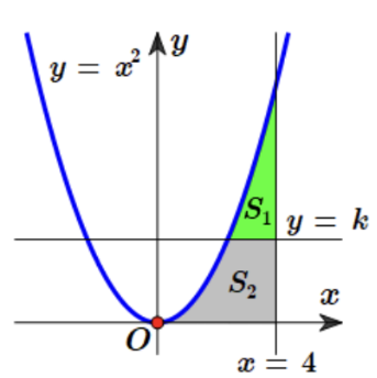 Cho hình phẳng (H) giới hạn bởi các đường \(y = {x^2}\), y = 0, x = 0, x = 4. Đường thẳng y = k với 0 < k < 16 chia hình (H) thành hai phần có diện tích S1, S2 (như hình vẽ). Tìm k để S1 = S2.