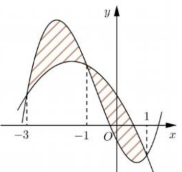 Cho hai hàm số \(f\left( x \right) = a{x^3} + b{x^2} + cx - \dfrac{1}{2}\) và \(g\left( x \right) = d{x^2} + ex + 1\) \(\left( {a,b,c,d,e \in \mathbb{R}} \right)\). Biết rằng đồ thị của hàm số y = f(x) và y = g(x) cắt nhau tại ba điểm có hoành độ lần lượt là -3;-1;1 (tham khảo hình vẽ). Hình phẳng giới hạn bởi hai đồ thị đã cho có diện tích bằng:
