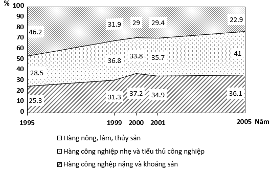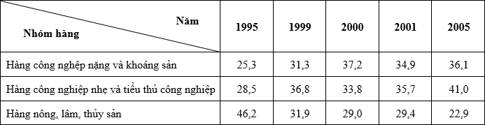 Cho bảng số liệu sau: Cơ cấu giá trị xuất khẩu hàng hóa phân theo nhóm hàng của nước ta