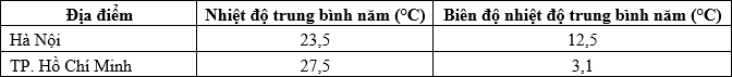 Cho bảng số liệu:Một số chỉ số về nhiệt độ của Hà Nội và TP. Hồ Chí MinhNhận định
