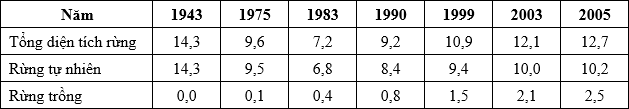 Dựa vào bảng số liệu sau đây về diện tích rừng của nước ta qua một số năm (Đơn vị: triệu ha)