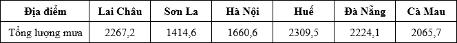 Cho bảng số liệu:TỔNG LƯỢNG MƯA TẠI MỘT SỐ ĐỊA ĐIỂM CỦA VIỆT NAM NĂM 2014 (Đơn vị: