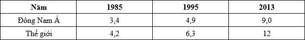 Cho bảng số liệu: Diện tích cao su của các nước Đông Nam Á và thế giới (Đơn vị: Triệu