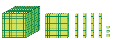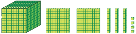 Chọn hình gồm 1 khối nghìn, 2 tấm trăm, 4 thanh chục và 3 khối đơn vị.