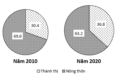 Cho biểu đồ về dân số nước ta phân theo thành thị và nông thôn nước ta năm 2010 và 2020 (Đơn vị: %)