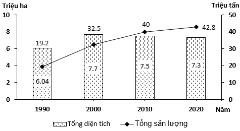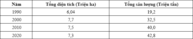 Diện tích gieo trồng và sản lượng lúa cả năm nước ta giai đoạn 1990 – 2020