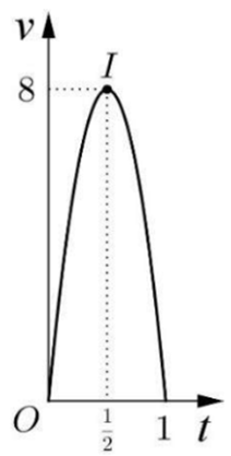Một người chạy trong thời gian 1 giờ, vận tốc v (km/h) phụ thuộc thời gian t (h) có đồ thị là một phần của đường parabol với đỉnh \(I\left( {\dfrac{1}{2};8} \right)\) và trục đối xứng song song với trục tung như hình bên. Tính quãng đường s người đó chạy được trong khoảng thời gian 45 phút, kể từ khi bắt đầu chạy.
