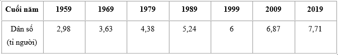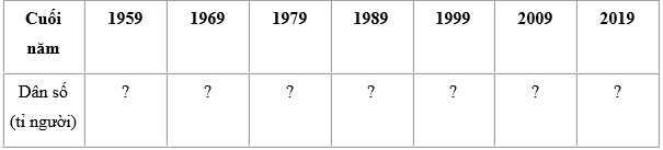 a) Lập bảng số liệu thống kê dân số thế giới cuối các năm 1959, 1969, 1979, 1989, 1999, 2009, 2019 theo mẫu sau: