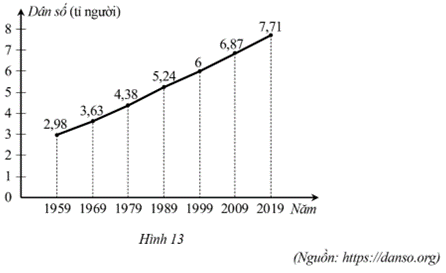 Biểu đồ đoạn thẳng ở Hình 13 biểu diễn dân số thế giới cuối các năm 1959, 1969 1979, 1989, 1999, 2009, 2019.
