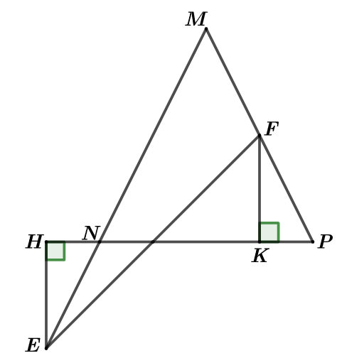 Hai tam giác: tam giác cân \(MNP\) và tam giác \(MEF\) có chung góc ở đỉnh \(M.\) Biết \(MF + ME = MP + MN.\) Chứng minh \(NP < EF.\)