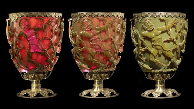 Chiếc cốc La Mã từ thế kỉ IV có thể đổi màu từ màu xanh khi chiếu sáng từ phía trước sang
